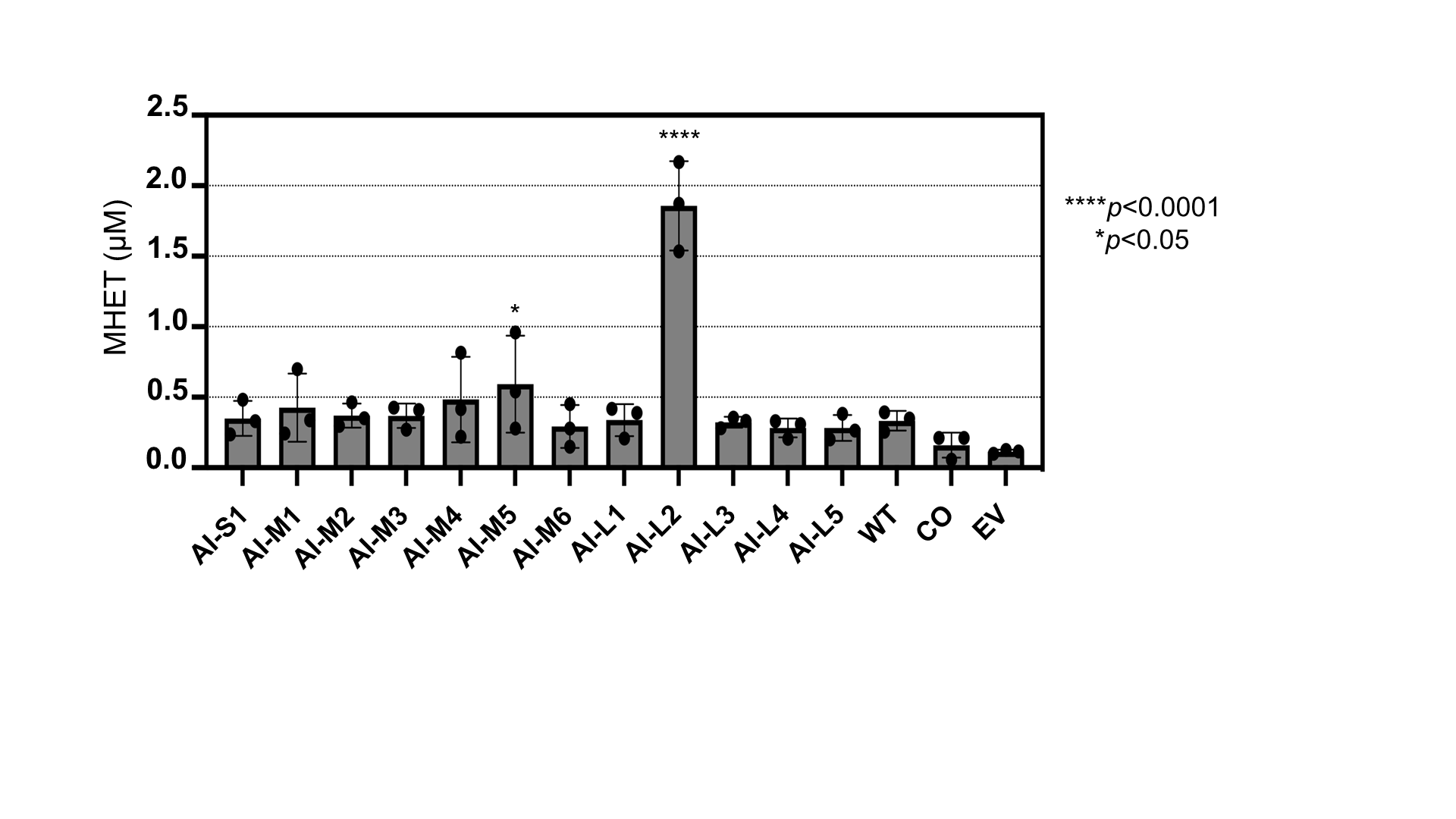 さらに、プラスチック分解酵素PETase(Ideonella sakaiensis由来)を例に、枯草菌(Bacillus subtilis)での発現実験を行いました。OrthologTransformerで再設計したPETase遺伝子は、従来手法のコドン最適化設計のPETase遺伝子(CO)を導入した場合と比べて、PETフィルム分解で生じる生成物(MHET)の生成量が最大で約10倍増加しました(図1)。AIが提案した配列が実際の酵素生産・活性向上につながることを示す成果です。