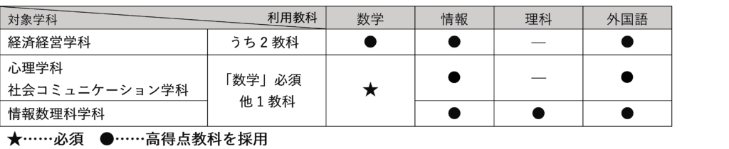 - 大学入学共通テストについて、経済経営学科は「数学」「情報」「外国語」のうち高得点の2教科、心理学科、社会コミュニケーション学科、情報数理科学科は「数学」を必須とし、その他の教科のうち高得点の1教科を採用します。