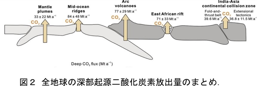 - 中央海嶺や沈み込み帯、ホットスポットなど第四紀の火山活動が活発な地域では、二酸化炭素放出量の報告例はあるが、大陸プレート同士が収束する大規模な隆起帯では研究例がない。