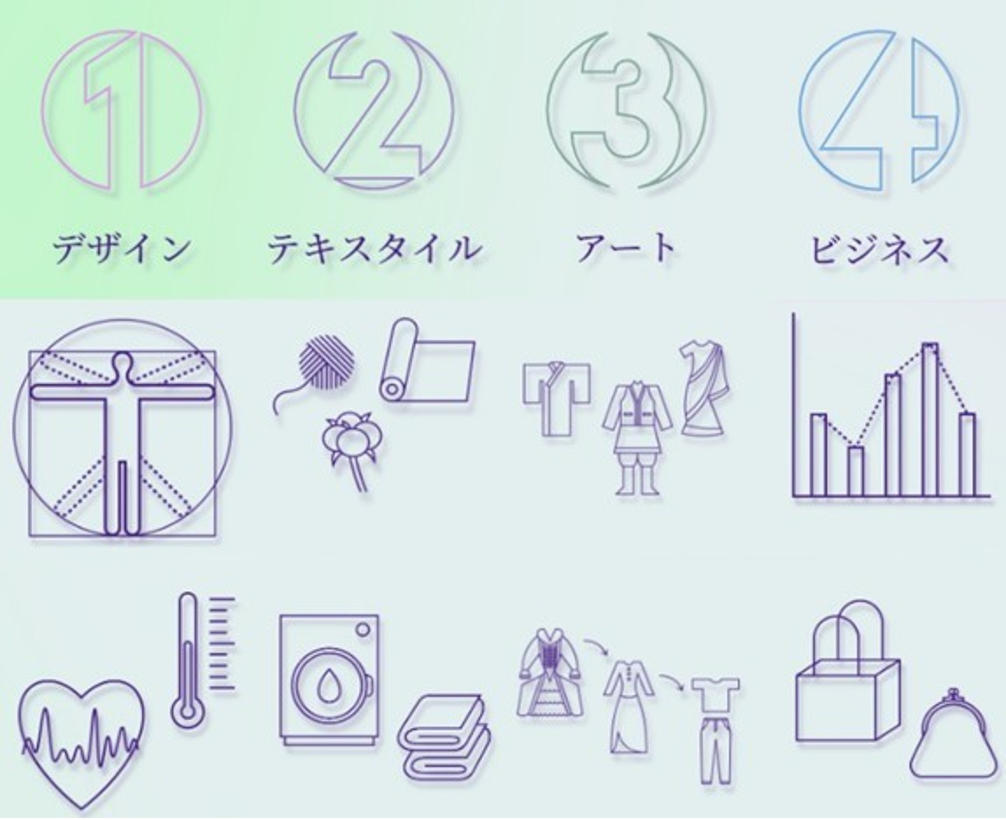 文理を問わず幅広い教授陣が揃い、充実した設備を誇る本学の「ファッションデザイン学部(仮称)」だからこそ実現できる、ファッションへの網羅的なアプローチをデザイン、テキスタイル、アート、ビジネスの4つの分野ごとに紹介しています。