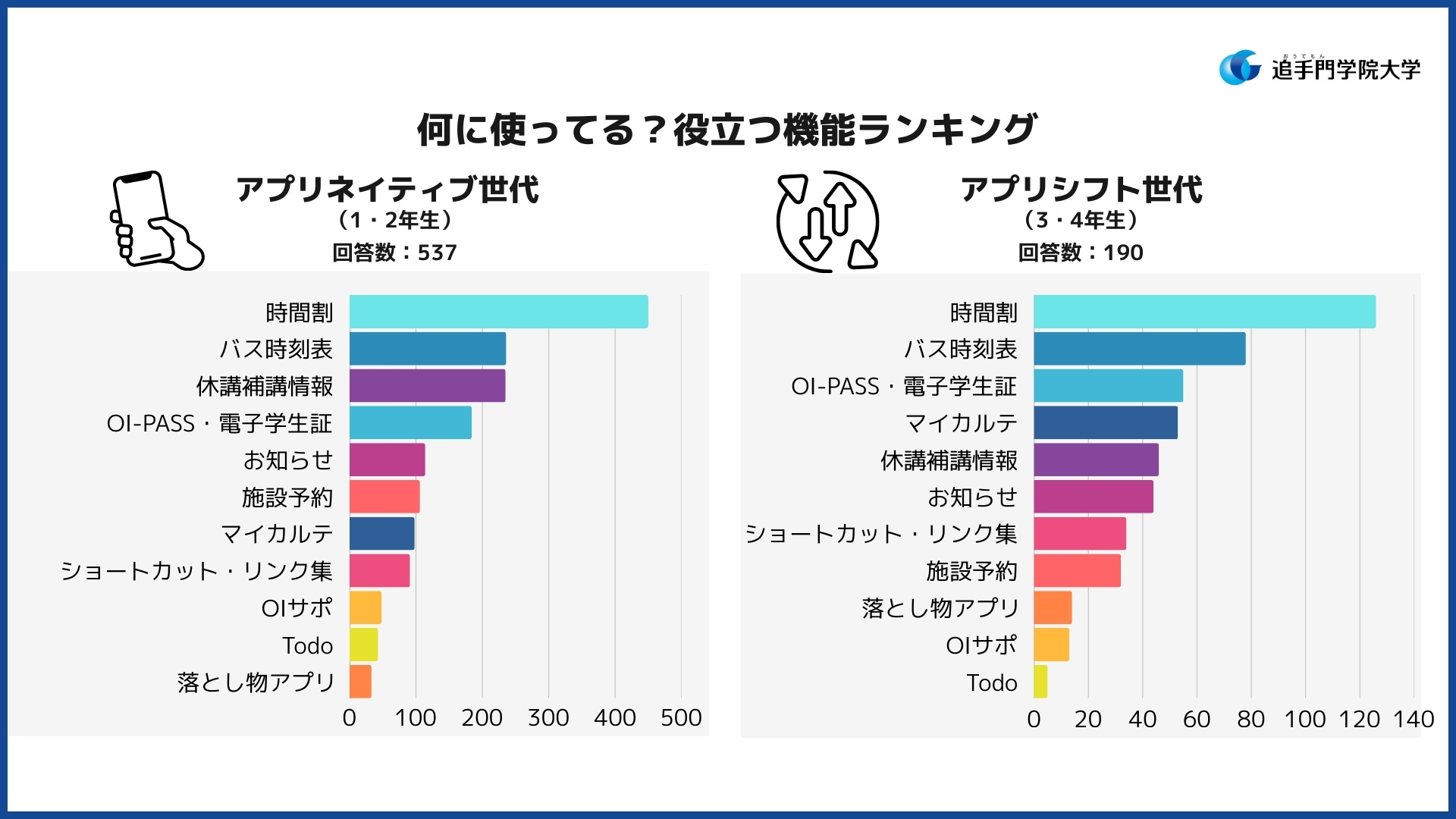 今回の調査では、入学時から公式アプリが導入されている「アプリネイティブ世代(1、2年生)」と、在学中に導入された「アプリシフト世代(3、4年生)」における、世代間の利用実態や評価の違いも分析。回答者の内訳は、1年生336人(46.1%)、2年生203人(27.8%)、3年生147人(20.2%)、4年生43人(5.9%)となっている。