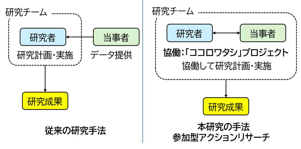 本研究では、うつ病などによる休職を経験した当事者と研究者が協働し、当事者参加型アクションリサーチ注2)の手法を用いて研究チーム「ココロワタシ」を立ち上げました(図1)。本取り組みでは、当事者を「研究対象」として扱うのではなく、研究の企画・実施・成果発信における対等なパートナーとして位置づけています(図2)。