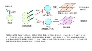 B 細胞は抗体産生に関わるリンパ球ですが、一部のB 細胞は免疫応答を抑制する物質を産生することで免疫応答を抑制することが知られており、このようなB 細胞は制御性B 細胞と呼ばれています。様々な自己免疫疾患で制御性B 細胞の異常が示され、また、移植の際の臓器の定着に制御性B 細胞が関わることが示されています。これまで、制御性B 細胞を増幅する刺激がいくつか知られていましたが、いずれも炎症を増悪させるもので、治療に使用することが困難でした。今回、B 細胞の表面に存在するCD22 と呼ばれる分子への抗体の中で特殊な活性を持った抗体が制御性B 細胞を増幅することを明らかにしました。さらに、この抗体を自己免疫機序によって発症する糖尿病(1型糖尿病)のモデル動物に投与すると糖尿病の発症が抑制され、皮膚移植の動物モデルに投与すると、移植に用いられている免疫抑制剤シクロポリンと同程度に移植片拒絶を抑制することが明らかになりました。一方、異物を投与した場合の免疫応答は抑制しないことから、この治療法が自己免疫や移植免疫といった有害な免疫応答のみを抑制することが明らかになりました。