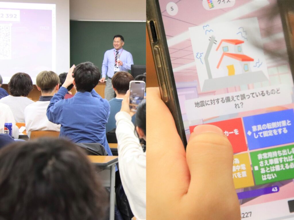 ▲防災総合基礎教育ではスマホを用いたクイズに挑戦(令和6年度の様子)