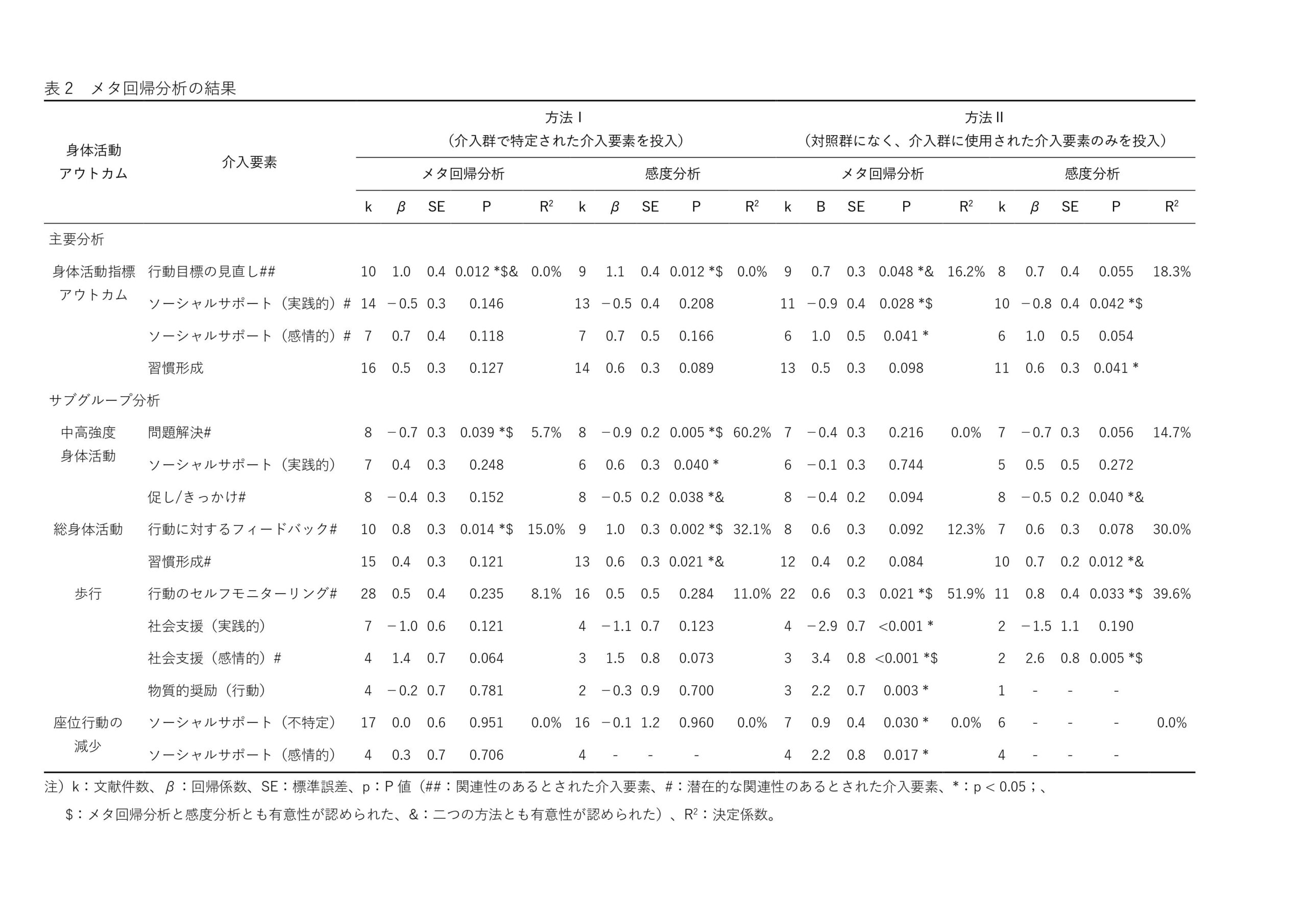 メタ分析の結果(添付表1)、中高強度身体活動と仕事および余暇時間の身体活動以外のアウトカムについては、介入効果の有意性が認められましたが(全てp<0.05)、感度分析では、身体活動指標アウトカム(標準化平均差SMD 注9)=0.19)と総身体活動(SMD=0.32)のみ、有意な介入効果が認められました(全てp<0.005)。メタ回帰分析の結果(添付表2)では、行動変容技法分類法のうち「行動目標の見直し」が有効な介入要素(2つの方法とも回帰係数>0,p<0.05)、「ソーシャルサポート(感情的)」が潜在的な有効要素(方法IIのみ回帰係数>0,p<0.05)として認められた一方、「ソーシャルサポート(実践的)」が潜在的な阻害要素(方法IIのみ回帰係数<0、p<0.05)であることが分かりました。また、感度分析では、「ソーシャルサポート(実践的)」が潜在的な阻害要素(方法IIのみ回帰係数<0,p<0.05)と示されました。さらに、「行動目標の見直し」(方法Ⅰ回帰係数>0,p=0.012;方法Ⅱ回帰係数>0,p=0.055)と「ソーシャルサポート(感情的)」(方法Ⅱ回帰係数>0,p=0.054)は有効と見られる傾向にありました。サブグループ分析および感度分析から、「行動に対するフィードバック」、「行動のセルフモニターリング」、「習慣形成」も潜在的な有効要素であり、「問題解決」および「促し/きっかけ」は潜在的な阻害要素であることが明らかになりました。