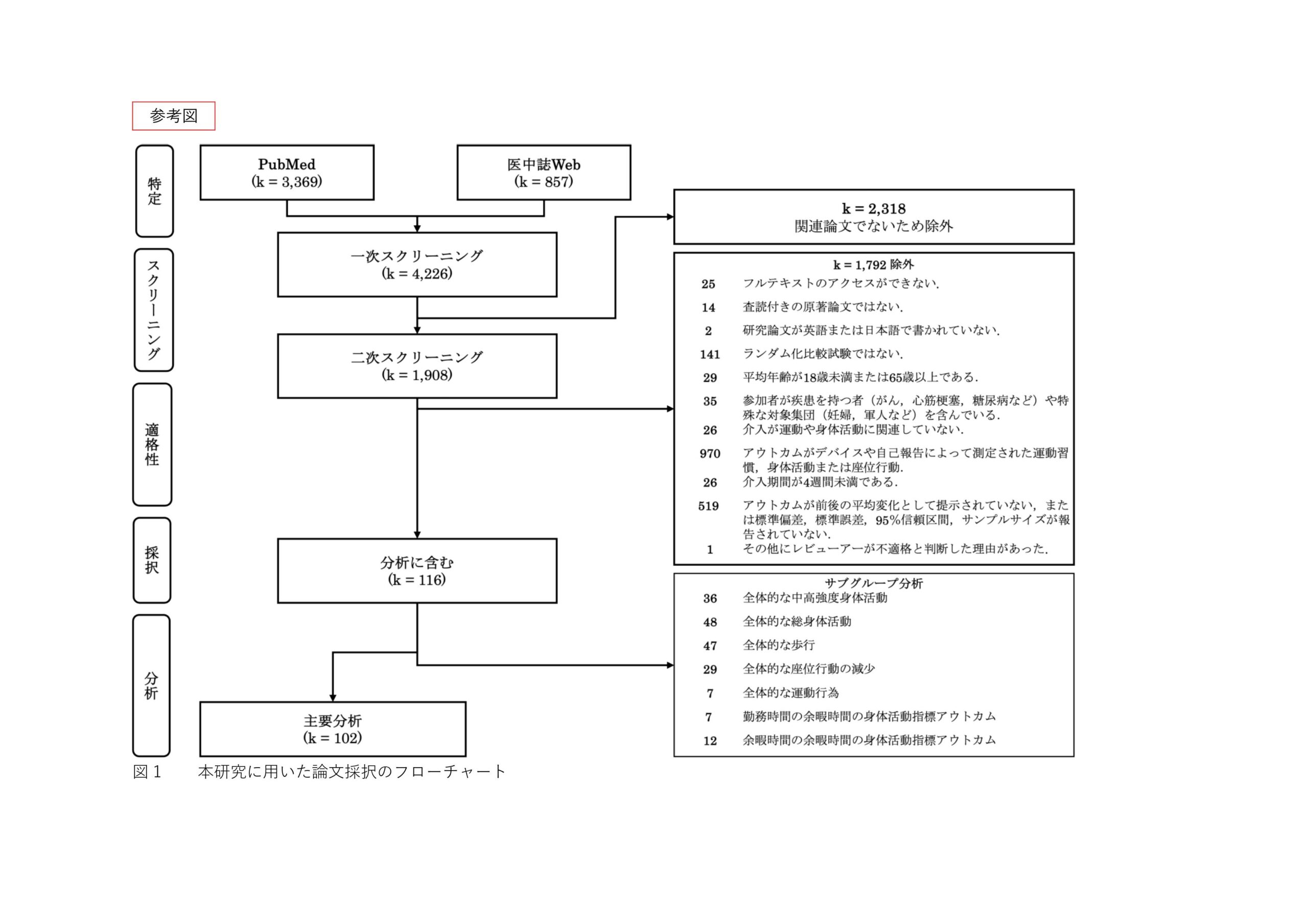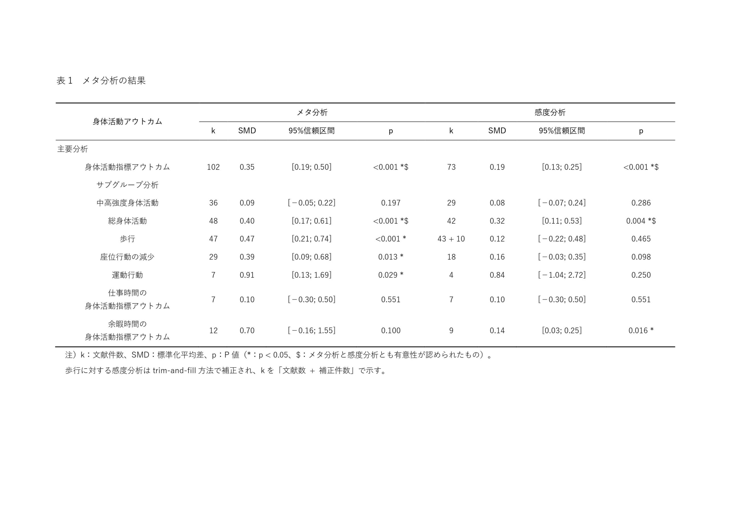 本研究では、身体活動の促進効果を全般的に分析するために、報告されたアウトカムから中高強度身体活動、歩行および総身体活動を「総合的な身体活動指標アウトカム」と定義し、複数報告の場合はそれぞれ、各身体活動指標アウトカムとして採択した。
