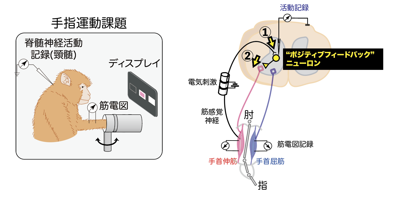 サルに手首の動きに応じて報酬(リンゴジュース)を与えるゲームを行わせ、その際の脊髄介在ニューロンの活動を、外科的手術によって取り付けた記録用チェインバーを用いて記録する実験方法を開発しました(図1左)。また、手首の伸筋の筋腱固有感覚(Group I)を含む末梢神経を電気刺激することによって、介在ニューロンへの感覚入力と、活動電位と手首伸筋筋活動との関係から介在ニューロンの伸筋への出力をそれぞれ同定する技術を開発しました(図1右)。これによって、運動中の霊長類において、固有感覚を伝える脊髄反射を中継する介在ニューロンを初めて同定しました。記録された大半の介在ニューロンは、伸筋から感覚入力を受けて、同じ伸筋を興奮させる特徴を持つ「ポジティブフィードバックニューロン」でした。