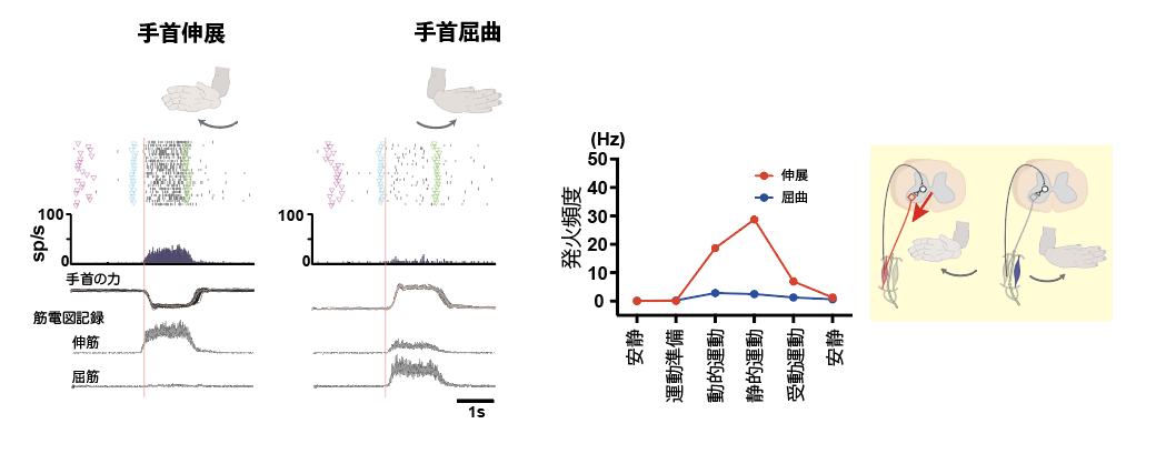 研究グループは、サルに手関節の随意運動課題を学習させ、課題遂行中に頸髄から脊髄介在ニューロン活動を記録しました。特に本研究では、脊髄介在ニューロンを「入力」と「出力」の両面から同定した点が特徴です。