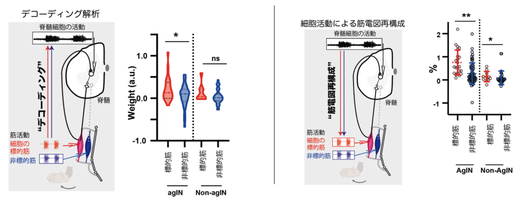 ポジティブフィードバックニューロンの活動パターンは、そのニューロンの支配する筋活動によってより高く推定(デコーディング)することができ(図3左)、また個々のニューロンの活動によって同じ筋肉の活動をより高い貢献度で再構成できることが分かりました(図3右)。これらから、ポジティブフィードバックニューロンは同じ筋から入力を受け、同じ筋に出力するという回路特徴を持つだけでなく、実際の運動時にそれらの筋活動を作り出している事が証明されました。
