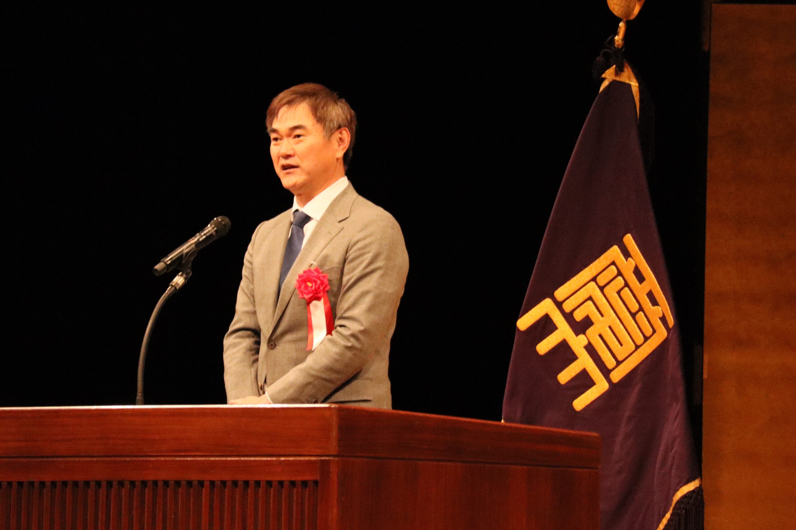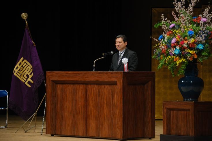 学長告辞では、卒業生への祝意を述べるとともに、手塚治虫氏の『鉄腕アトム』を例に、多様性と常識にとらわれない発想の重要性を語られました。アトムが誕生したとされる「2003年4月7日」は大半の卒業生と同い年であり、作品が当初は「常識」によって批判されていたことを紹介され、未来は常識を超えて生まれるものであり、作中の未来像よりも、現実の社会はスマートフォンやAIなどで大きな発展を遂げているとして、「未来は多くの人の夢と努力の結集であり、その担い手は次の世代であるみなさんです。本学で学んだことを胸に、自信を持って、皆さんの未来に向けて突き進んで行ってください。」とエールを送られました。
