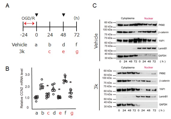 A, ヒト腎臓細胞HK-2に虚血再灌流刺激(OGD/R)による線維化を誘導し、0、48時間後(▼)にDMSO(Vehicle)または化合物3k(3k)を投与した。B, 定量的PCR解析。化合物3kは刺激により誘導される線維化促進遺伝子CCN2の発現増加を抑制した(b, d, f対c, e, g)。C, ウエスタンブロット解析。刺激を受けた細胞では、核内にPKM2、β-カテニン、YAP1が検出される(Vehicle(上図), Nuclear)。化合物3k存在下では、いずれの分子についても核内移行が減少した(3k(下図), Nuclear)。(Kosakai et al. (2026) JBC, doi:10.1016/j.jbc.2025.111029より改変)