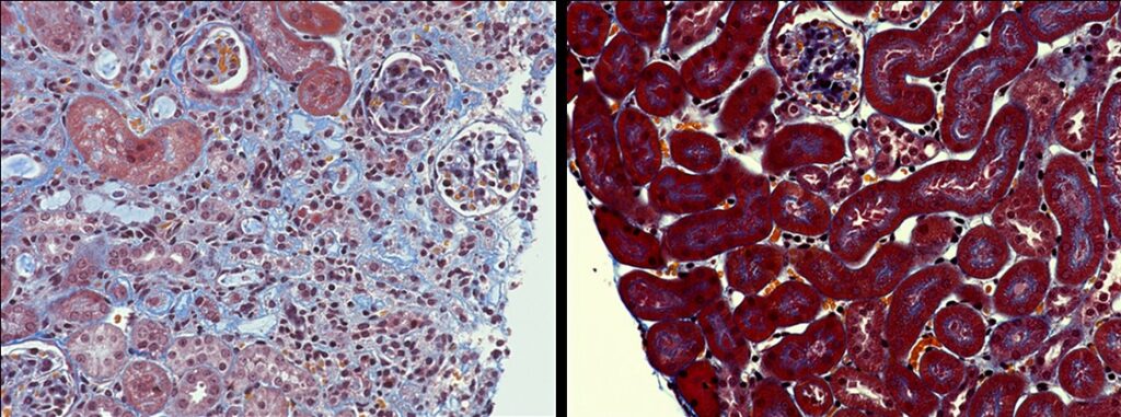 虚血再還流による腎障害の誘導後14日で、線維化が進行し腎臓の構造が損なわれる(左図:ミズイロの領域)。この期間に化合物3kを投与すると、線維化が抑制され正常構造が保たれる(右図:アカ-褐色の領域)。(マッソン・トリクローム染色、顕微鏡写真)