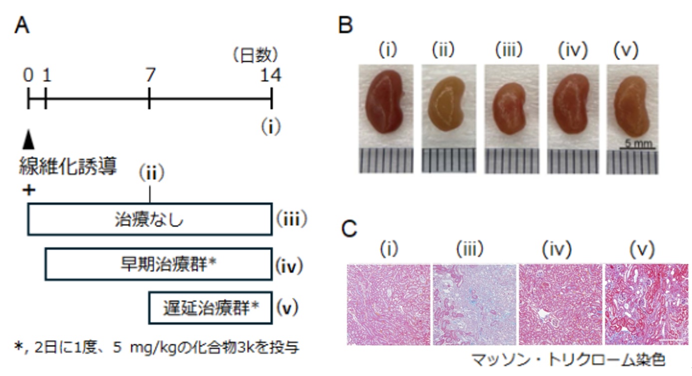 A, 実験のプロトコル。正常コントロール(i; 誘導処理なし)、線維化誘導処置後、治療なしでの経過(ii-7日後、iii-14日後)と治療群(iv-1日後、v-7日後より14日後まで化合物3kを投与した)を解析した。B, 7日後(ii)および14日後(iii)に観察される腎臓の萎縮が3k投与により抑制された(ivおよびv)。C, 線維化の進行(iii, ミズイロの領域)に対し、化合物3kは抑制または回復(ivおよびv)効果を示した。(Kosakai et al. (2026) JBC, doi:10.1016/j.jbc.2025.111029より改変)