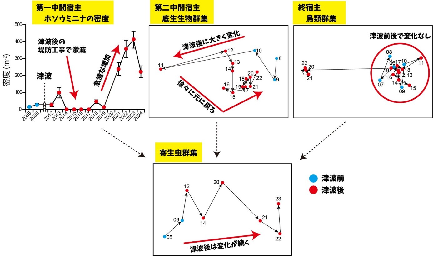 寄生虫も含めた干潟生態系への津波の影響について、長期的な調査を行ったのは本研究が世界で初めてです。本研究成果は、2026年3月5日付で英国王立協会が発行する国際科学雑誌Philosophical Transactions of the Royal Society B電子版に掲載されました。