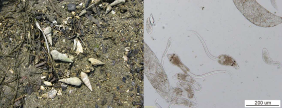 図2.津波を生き抜いたホソウミニナ(写真左側)とホソウミニナに感染する二生吸虫類の一例(写真右側、種名:Cercaria batillariae)。