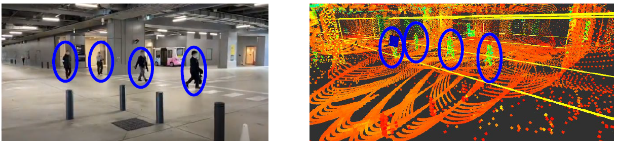 建物に設置した複数台のLiDARから取得したロボット周辺の車や人といった動体のデータをエッジコンピュータで解析し、デジタルツインを構築します。その後、デジタルツインから、ロボットの自動制御に必要な空間情報をリアルタイムに抽出します。