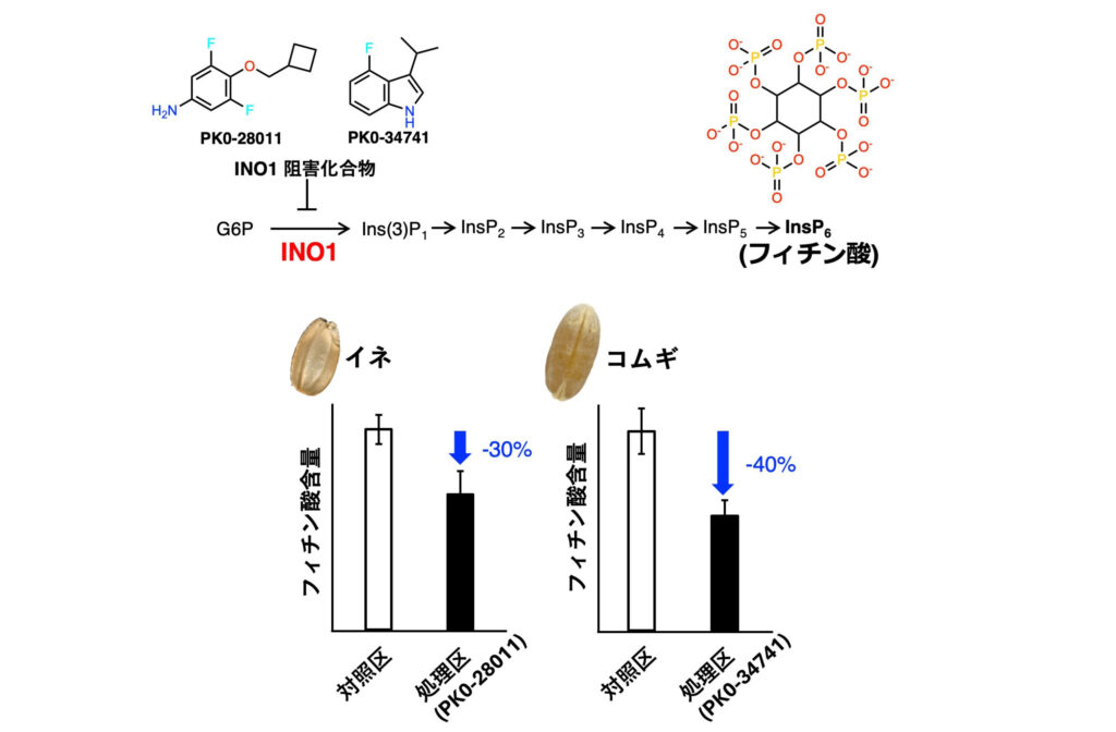 研究グループはフィチン酸生合成の初期段階を担う酵素に着目し、医薬品開発で用いられるフラグメントベース創薬の手法を応用。1000種類以上の化合物をスクリーニングし、同酵素を選択的に阻害する複数の化合物を発見した。これらをイネやコムギの穂に処理したところ、種子中のフィチン酸含量を約30~40%低減させることに成功。発芽率や収量への影響も見られなかった。
