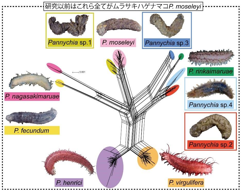 10種のうち5種は、形態学的特徴から、ムラサキハゲナマコ P. moseleyi、ハゲナマコ P. virgulifera、 シンカイハゲナマコ P. henrici、ナガサキハゲナマコ P. nagasakimaruae、ミサキハゲナマコ P. rinkaimaruae に、それぞれに同定できました。さらに、もう1種はムラサキハゲナマコの新参異名の一つ Laetmophasma fecundum に同定され、ハゲナマコ属の独立した種 P. fecundum として再設立されました。残りの4系統群は未記載種(新種候補)と考えられました。