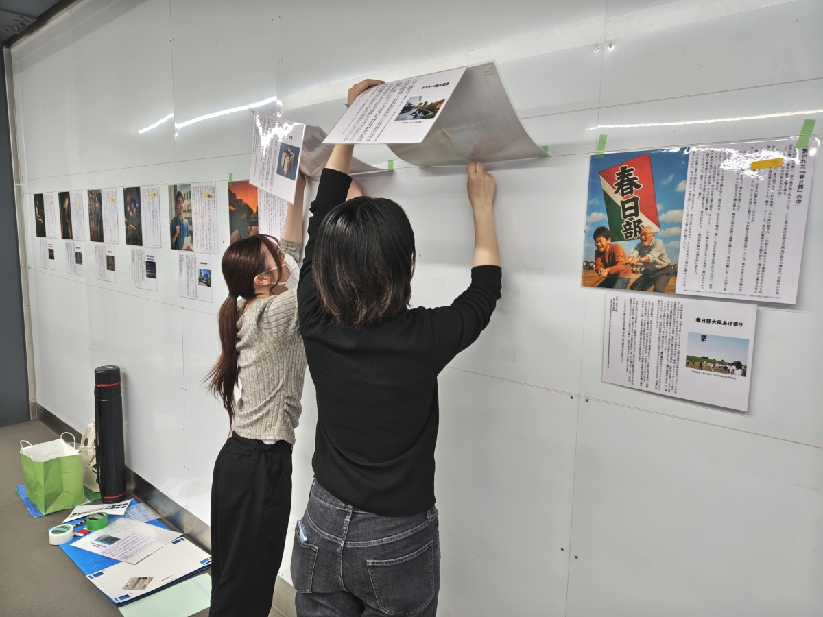 作品は伊藤ゼミに所属する学生(当時2~4年生)が制作し、地域資源の調査、ストーリー構築、AI生成、解説作成まで一貫して取り組んだ。また、展示の設営は現3年生の吉本愛美さんと宮田琉那さんが中心となって行い、掲示位置や間隔の調整など、公共空間での展示に求められる精度の高い施工を実現。さらに、メディアデザインを専門とする河合麗奈助教が展示全体の構成についてサポートし、作品の視認性や流れを考慮した展示順の設計を行った。