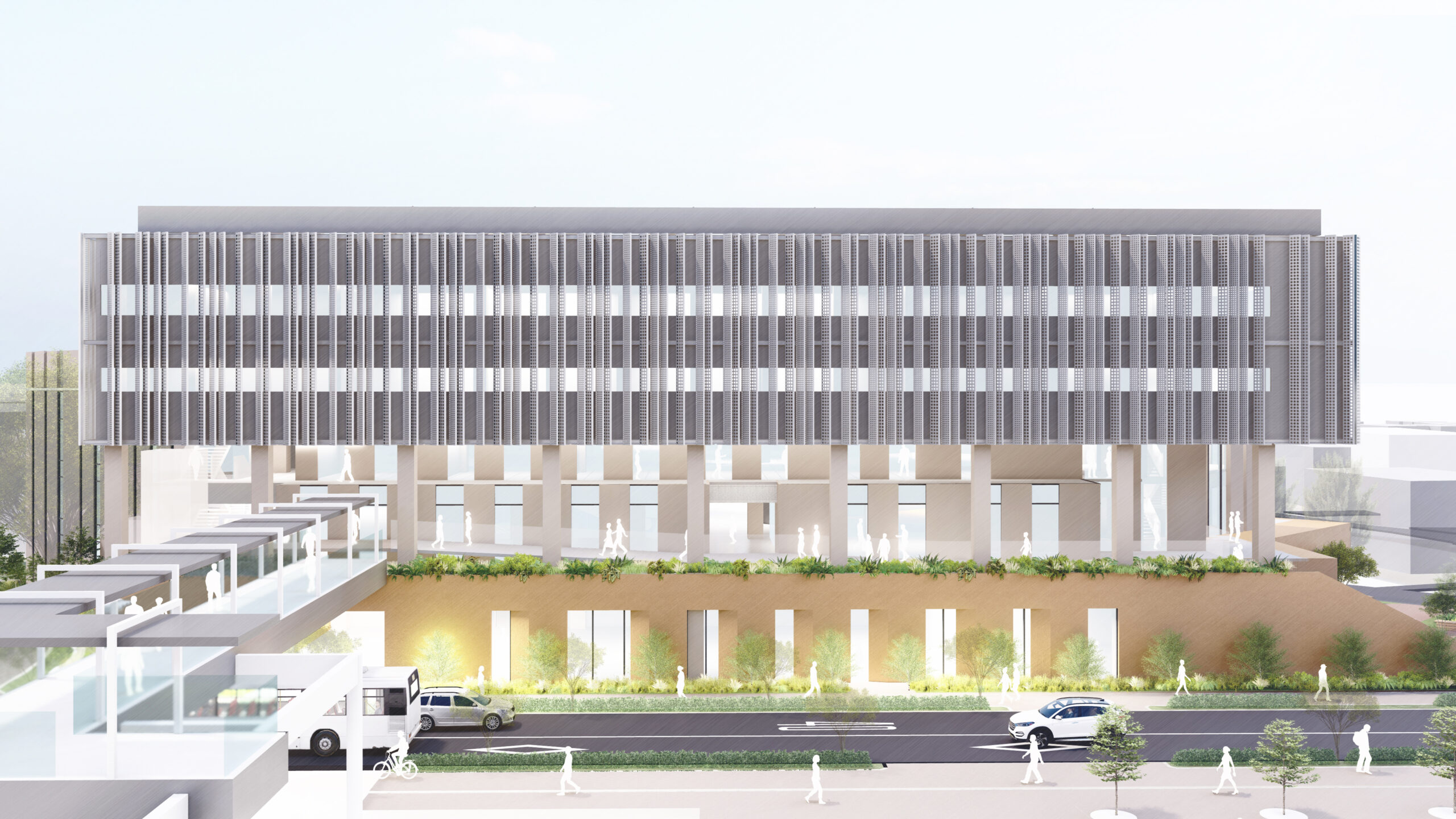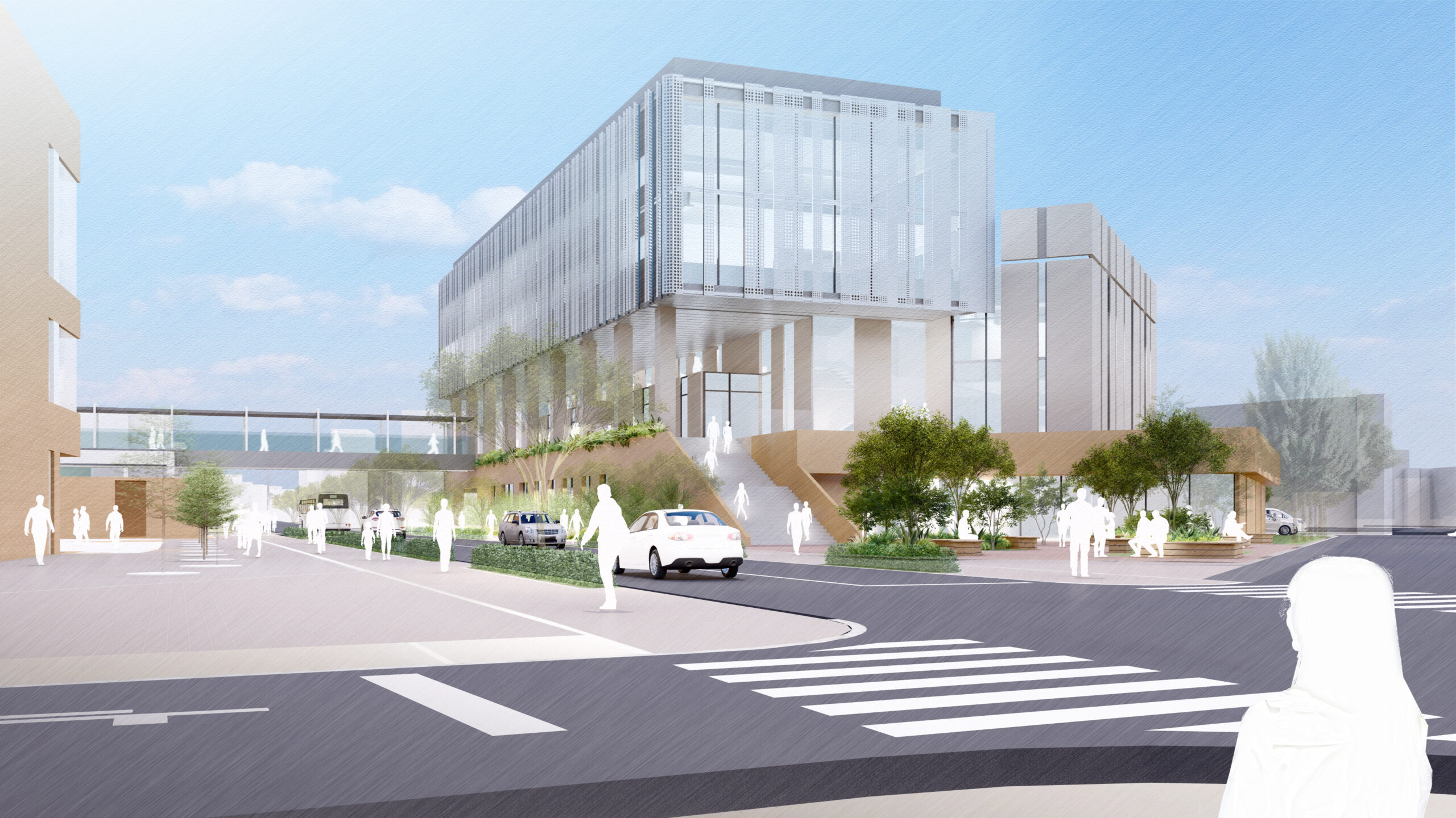 梅ヶ丘駅方面の広場から34号館まで、雨天でも快適に移動できる歩行動線を確保します。新棟と34号館を2階レベルで接続する「上空通路」を整備し、世田谷校舎間の日常的な移動を支えるとともに、キャンパス全体の回遊性向上に寄与します。