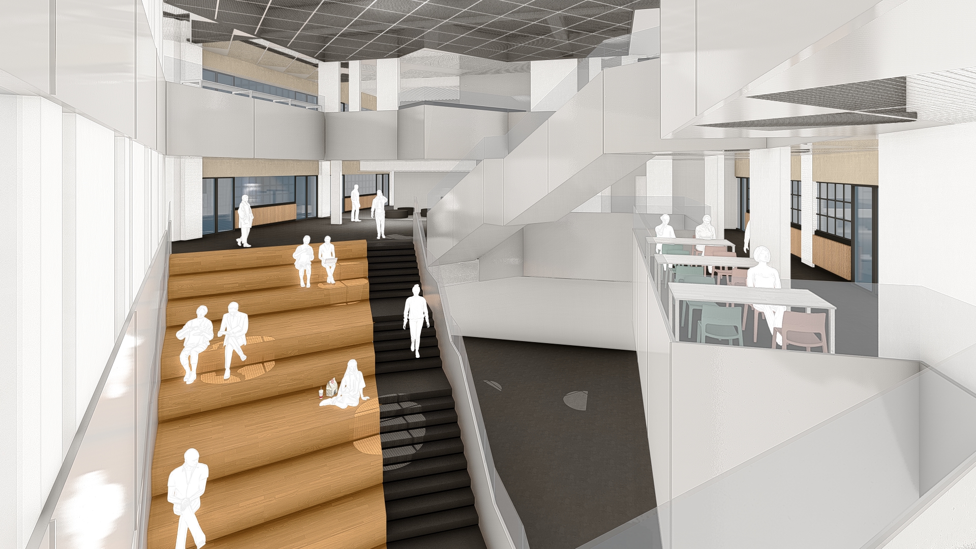 個人学習からグループワーク、分野横断的な交流までを受け止める空間を集約し、学部・学科を超えた偶発的な出会いや新たな学びを生み出す場を創出します。授業前後の予習・復習やパブリックビューイング等にも活用できる柔軟な環境を整え、多様な交流と学修の循環を促進します。
