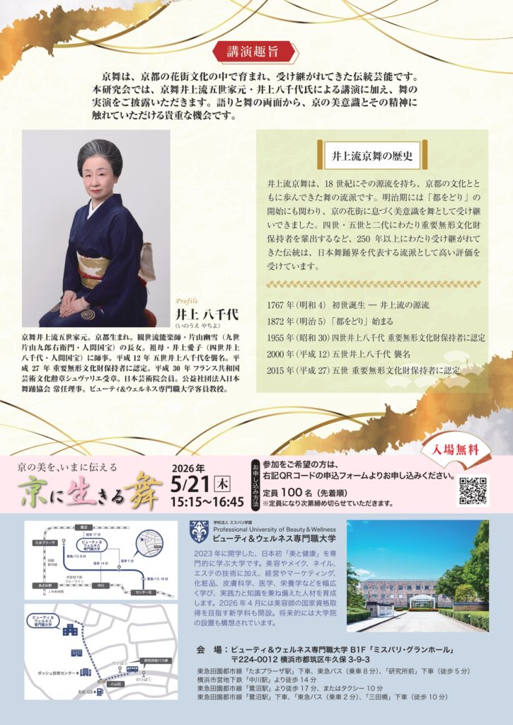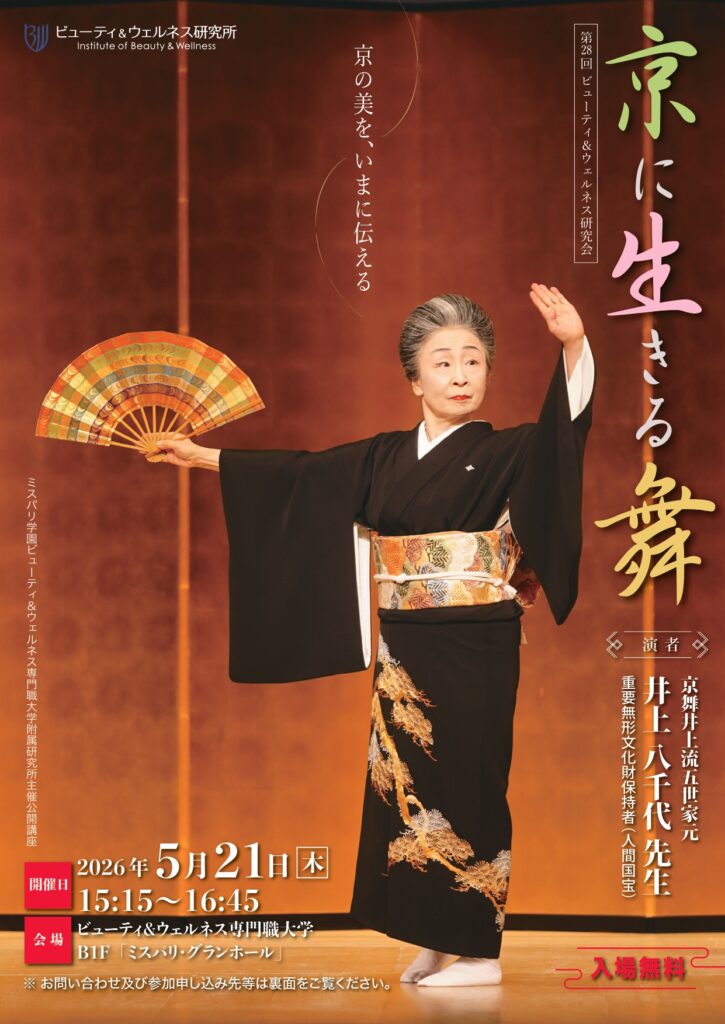 ビューティ&ウェルネス専門職大学(神奈川県横浜市、学長:室伏きみ子)は、2026年5月21日(木)、「第28回ビューティ&ウェルネス研究会」を開催いたします。今回は、京舞井上流五世家元であり、重要無形文化財保持者(人間国宝)の井上八千代氏をお迎えし、「京に生きる舞」をテーマにご講演と舞の実演を行っていただきます。