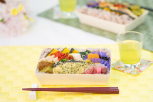 管理栄養学科栄養教育学研究室では、産学連携(味の素株式会社・株式会社銀しゃり)による「おいしい減塩プロジェクト」の一環として、自然と食塩摂取を控えることができる食環境づくりの実践に取り組んでいます。その一環として開発した弁当「こだわり素材の『おいしい宝箱』」は、食塩相当量2.3gでありながらスマートミール🄬「しっかり」の基準を満たした満足感のある一食です。食材には、高座豚ローストなど県内産の食材を採用したほか、鮭は大学の連携先である北海道標津町産のものを使用。あわせて、食環境づくりに関するアンケートおよび追跡調査を実施し、その結果は学生の卒業研究に活用されます。(担当:管理栄養学科教授・吉岡有紀子)