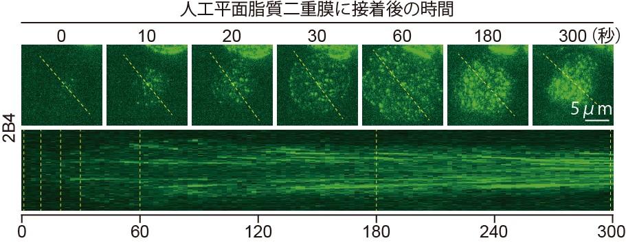 今回、2B4のリガンドであるCD48を組み入れた「人工平面脂質二重膜」を新たに作成し、2B4を発現しているT細胞を二重膜の上にのせ、2B4の挙動を1分子レベルでイメージング解析しました。T細胞は数分をかけて脂質二重膜に接着し、その接着面に連続的に形成される、CD48との結合を機に2B4分子が数十個集まったクラスターが観察されました(図1)。