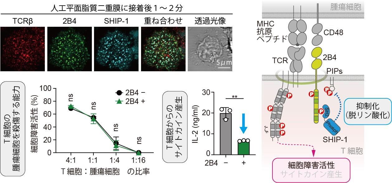 2B4のクラスターは、抗原ペプチドが結合した主要組織適合性複合体(pMHC)との結合を機にできるTCRの凝集「TCRマイクロクラスター」と同じ位置に形成され、さらに脂質脱リン酸化反応を担う酵素(フォスファターゼ)SHIP-1を呼び寄せることが分かりました(図2上段)。この抑制性シグナルの挙動がT細胞の機能にどう影響を与えているのか実験したところ、T細胞ががん細胞を攻撃する細胞障害活性には差は見られなかった一方(図2左下段)、T細胞からのサイトカイン産生が抑制されることが分かりました(図2中下段)。