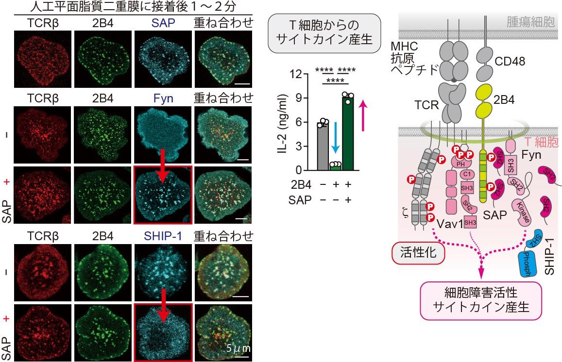 続いて、2B4のアダプター分子であるSAPを2B4と同時にT細胞に発現させてイメージング解析を行いました。その結果、2B4マイクロクラスターと同じ位置でSAPはクラスターを作り、さらに、チロシンリン酸化酵素であるFynも同様にクラスターを形成するようになりました(図3左上段、左中段)。一方で、先ほど集積が見られたSHIP-1の集積が見られなくなることが分かりました(図3左下段)。つまり、SAPが2B4に結合すると、1) FynがSAPを介して2B4にリクルートされる、2) SHIP-1が2B4に集積できなくなる、ことで活性化のシグナル複合体を形成するようになることが確認されました。この結果、サイトカイン産生が増えることも分かりました(図3中)。