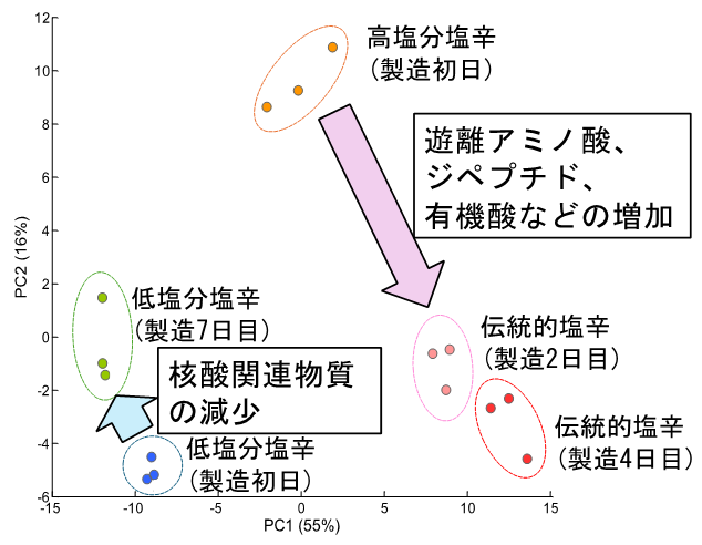 伝統的な高塩分イカ塩辛の製法では、低塩分の製法と比べて、遊離アミノ酸やジペプチド、有機酸などの代謝産物が顕著に増加し、イカ塩辛特有の深い味わいを形成することが示唆されました。