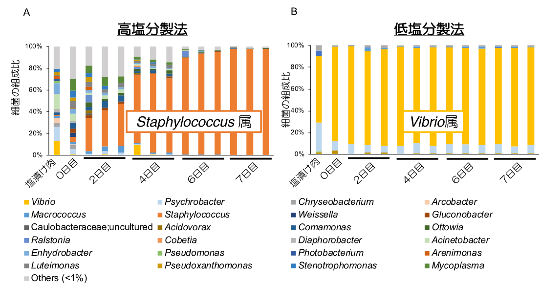 製造初期は両製法ともにVibrio属やPsychrobacter属の細菌が見られましたが、高塩分の製法では発酵が進むにつれてStaphylococcus属が優占化していきました【図2A】。低塩分の製法では細菌叢の変化はほとんど起こっておらず、Vibrio属が優占化したままでした【図2B】。