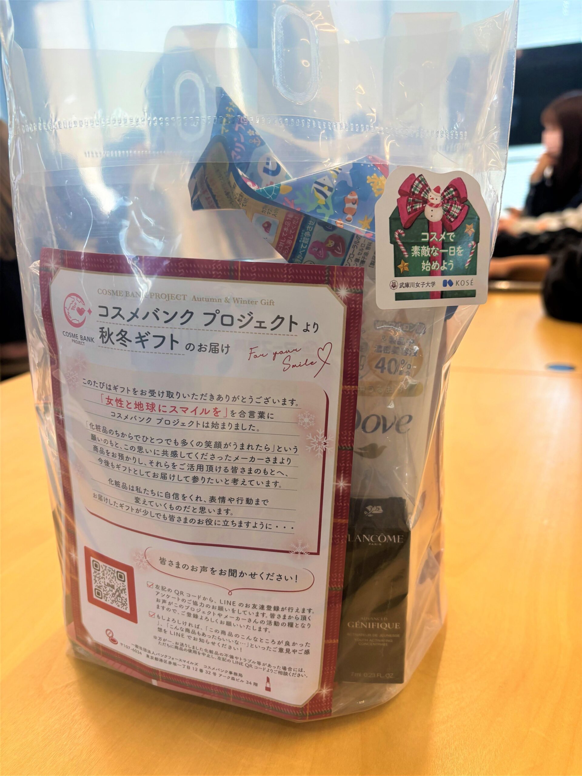 経済的困難下にあるひとり親世帯の女性に化粧品を寄贈する「コスメバンクプロジェクト」に武庫川女子大学経営学部の学生と附属高校の生徒が参加し、12月6日、プロジェクト参画企業の「株式会社コーセー」(以下、コーセー)の社員とともに化粧品を一つひとつ袋詰めにし、メッセージを添えて2000セットを各家庭に送りました。
