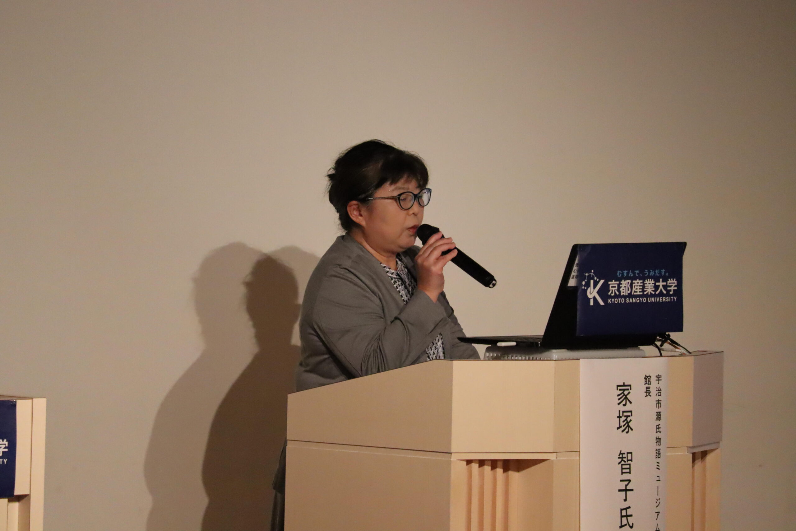 家塚 智子氏(宇治市源氏物語ミュージアム館長)による講演会では、葵、賢木(さかき)の巻を主に取り上げて解説。『源氏物語』が源氏絵をはじめ、能や美術工芸品、漫画などを通して後世に広がったこと、『源氏物語』で「あそぶ」ことを紹介しました。