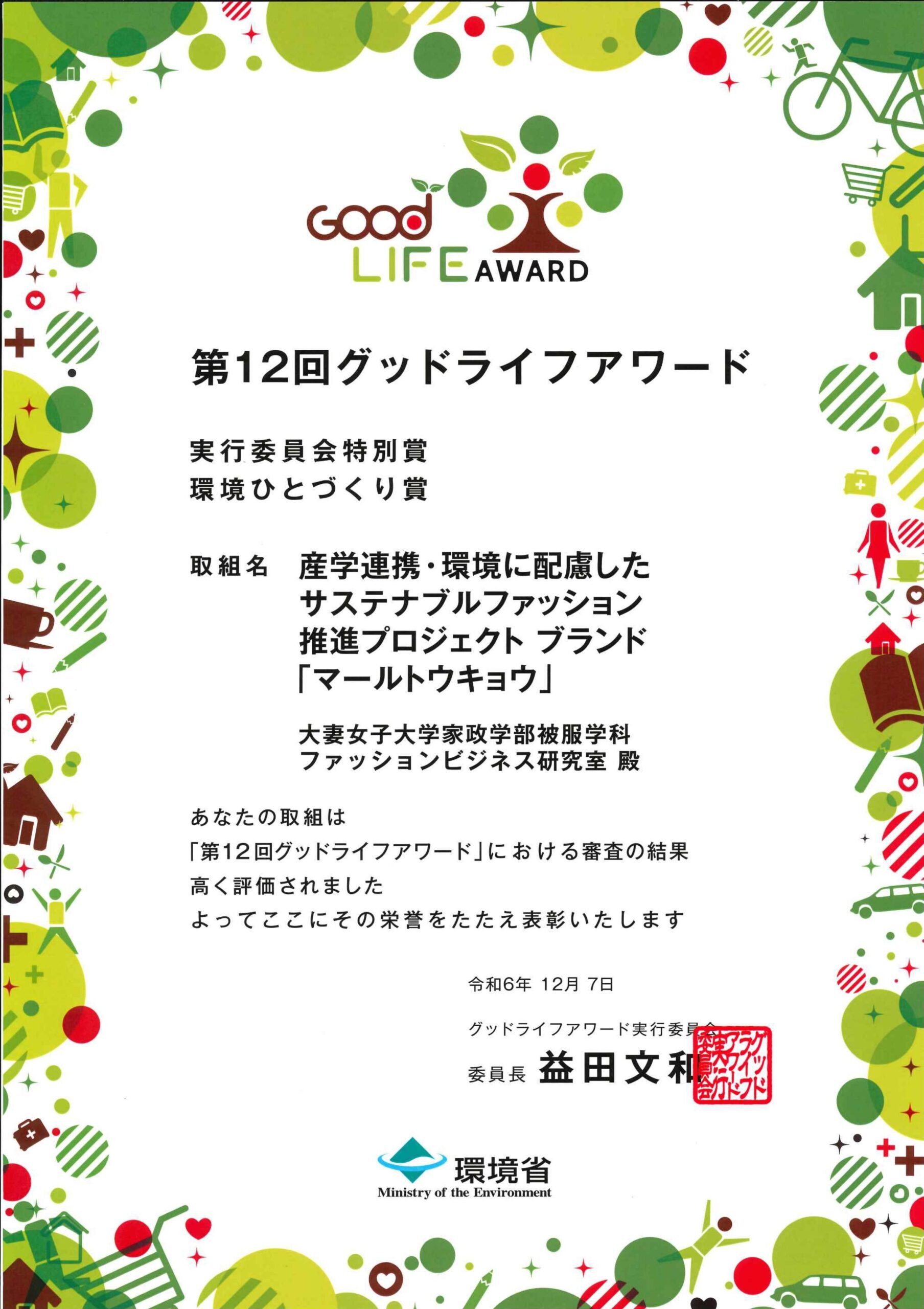 こうした活動が評価され、このたび、環境省主催の第12回グッドライフアワードで実行委員会特別賞「環境ひとづくり賞」を受賞した。