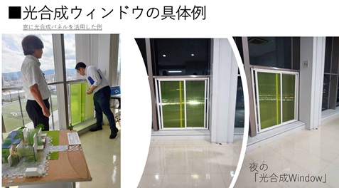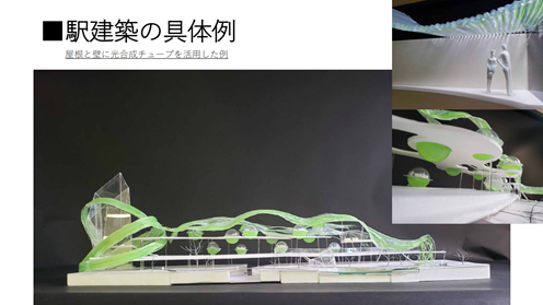 再生可能エネルギーに関する研究は多く行われていますが、光合成で水素イオンを発生させて電気エネルギーに変え、酸素を生み出し、緑色の美しい空間を作り出せる、という3点を同時に可能にしているものは他にありません。川上研究室と松尾研究室では、実際にびょうぶや窓に活用する光合成パネルを作成。屋根やひさしに光合成パネルを活用した、集合住宅やバス停などの建築デザインを考案しています。