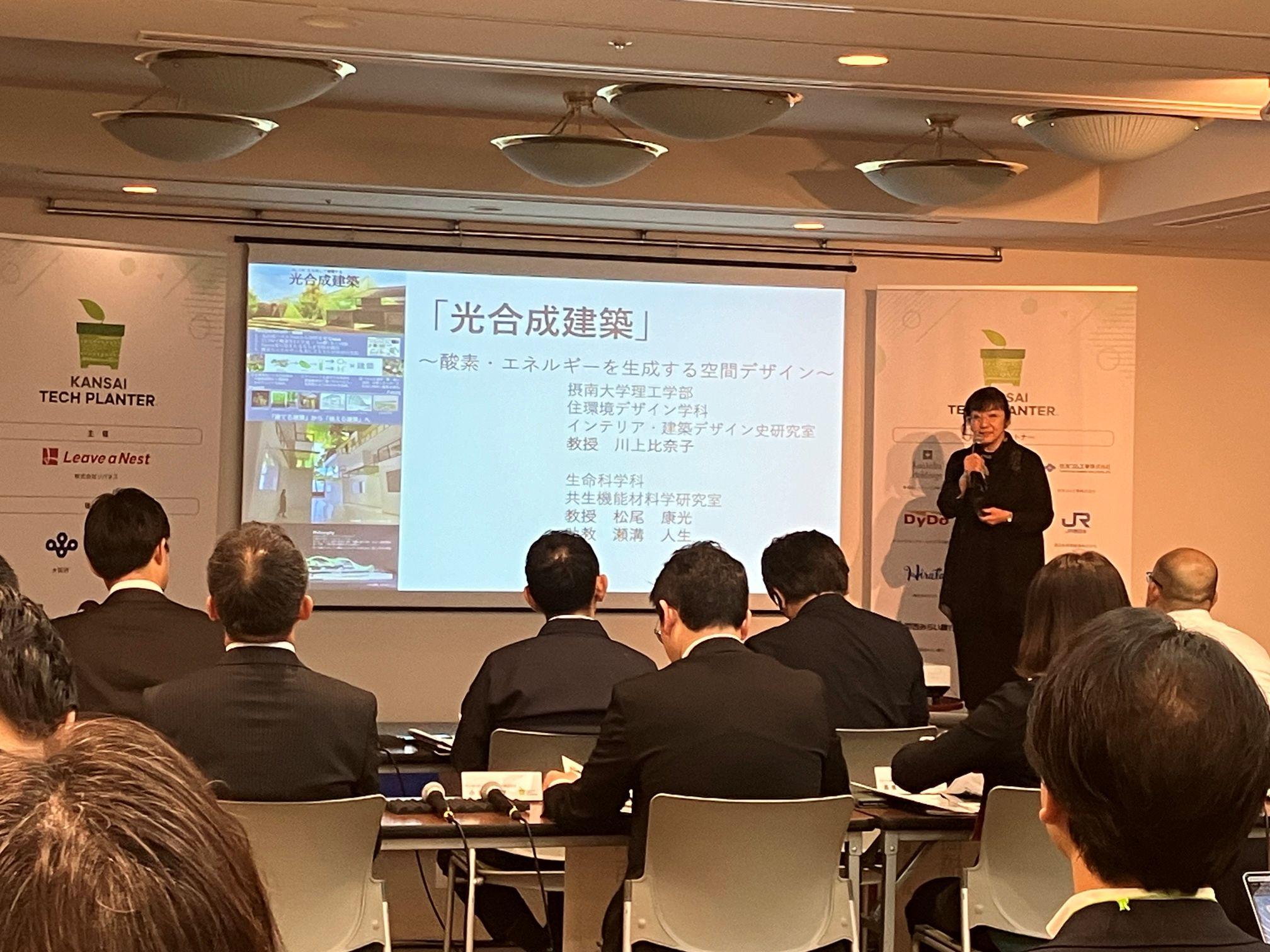 川上教授のチームは、2024年に開催された「関西テックプランター」に参加し、28組の中からファイナリスト12組に選ばれ、11月16日に開催された「第2回関西テックプラングランプリ」で、企業賞として大和リース賞を受賞しました。大会では、川上教授と松尾教授のチームが開発した「光合成建築」について発表。その結果、会場の投票でも1位を獲得するなど注目を集めました。リバネスおよびパートナー企業によって構成される審査員により、1)新規性 2)実現可能性 3)世界を変えそうか 4)パッションがあるかの4つの項目を基準として審査が行われました。