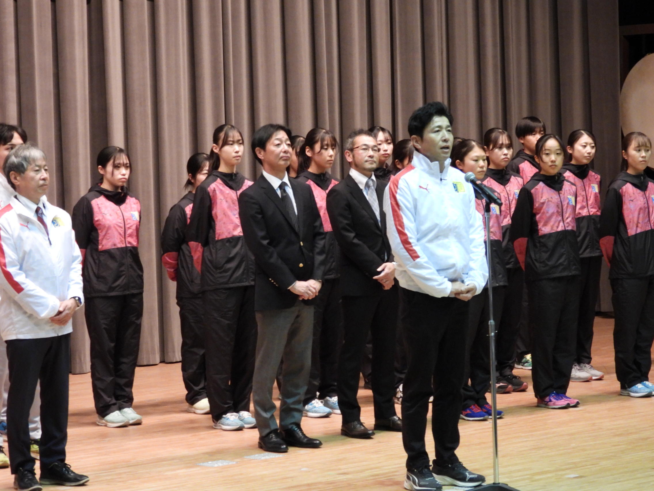 女子駅伝部の赤羽周平監督は「全日本では皆様の応援の力もあり、目標の3位をクリアすることが出来ました。チームは駅伝日本一を目指して活動していますが、いよいよ少し近づいたかという状況です。全日本の後、故障者が出たり、アクシデントがあったりと昨年同様、バタバタしている状況ですが、富士山女子駅伝も3位表彰台と目標をぶらさずに日々歩みを進めているところです。連続して目標を達成することは簡単ではありませんが、1年間の締めくくりの大会ですので、目標に向けて笑顔でチャレンジ出来たらと考えています」と決意を述べました。
