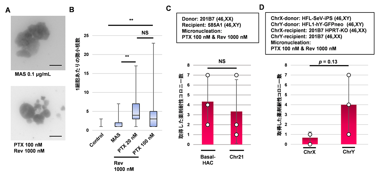 (A) 各種、分裂期阻害剤を添加し培養したhiPS細胞の核標本写真。Metaphase arresting solution (MAS)を0.1 µg/mLで処理した場合でも微小核の形成が観察されるが、PTX 100nMおよびRev 1000 nMを添加し培養した場合では、より多くの微小核が形成されることが観察された。(B) 化合物非添加条件(Control)を含めて薬剤添加濃度を変化させた際の1細胞あたりの微小核数を数を示すグラフ。PTXおよびRevを用いて顕著に多くの微小核が形成された。(C) hiPS細胞(株名:201B7)よりBasal-HAC、もしくはChr21をhiPS細胞(株名:585A1)に導入した際に得られた薬剤耐性クローン数を示すグラフ。(D) hiPS細胞(株名:HFL1-SeV-iPS)よりChrX、もしくはhiPS細胞(株名:HFL1-hY-GFPneo)よりChrYをhiPS細胞(株名:201B7 HPRT-KOもしくは201B7)に導入した際に得られた薬剤耐性クローン数を示すグラフ。