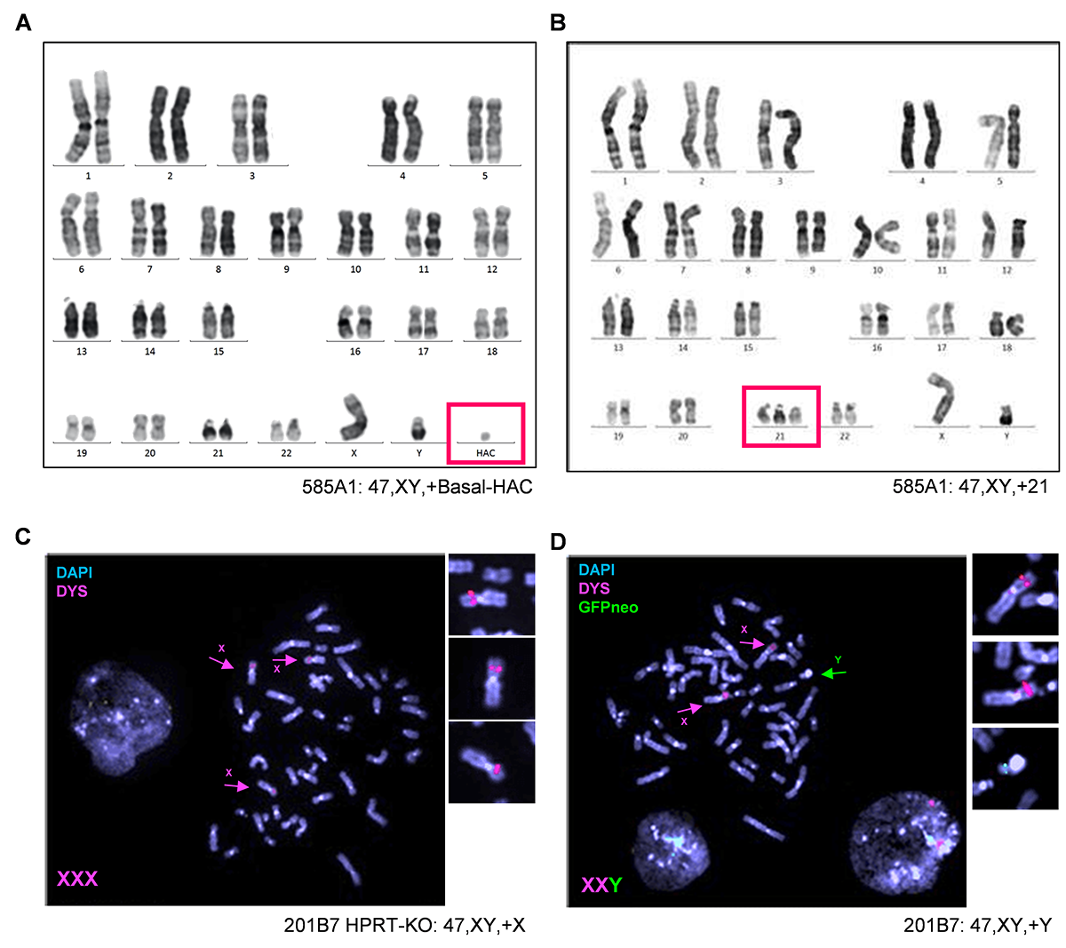 (A) Basal-HACを導入した585A1の核型解析結果。HACが宿主染色体から独立して保持されていることが確認された。(B) Chr21を導入した585A1の核型解析結果。Chr21が3本保持されていることが確認された。(C) ChrXを導入した201B7 HPRT-KOのFISH解析結果。DNAをDAPI(青)、X染色体をDYSTROPHIN遺伝子プローブ(赤)にて染色した。赤色シグナルで示されるX染色体が3本保持されていることを確認した。(D) ChrYを導入した201B7のFISH解析結果。DNAをDAPI(青)、X染色体をDYSTROPHIN遺伝子プローブ(赤)、Y染色体をタグ付けに用いたGFPneo遺伝子プローブ(緑)にて染色した。赤色シグナルで示されるX染色体が2本、緑色シグナルで示されるY染色体が1本保持されていることを確認した。