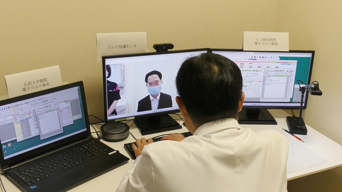 記者会見後には遠隔医療センターでオンライン診療のデモンストレーションが実施され、弘前大学の医師がむつ総合病院の診察室にいる患者役に対してビデオ通話で問診を行い、専用システムを使用して病院側の電子カルテに情報を書き込む様子が公開された。