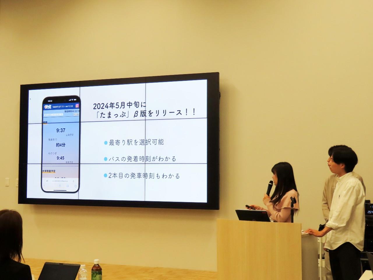 多摩キャンパスでは、多くの学生が路線バスを利用して通学している。そこで、バス乗車の待ち時間を減らすため、大学から最寄り駅までのバスの時刻表を簡単に調べることのできるアプリ「たまっぷ」を開発した。さらに、駅周辺の飲食店と提携しアプリ利用者向けの割引サービスを付加したことで、学生の利用を促し、キャンパス周辺の地域活性化にも寄与することを目指す。