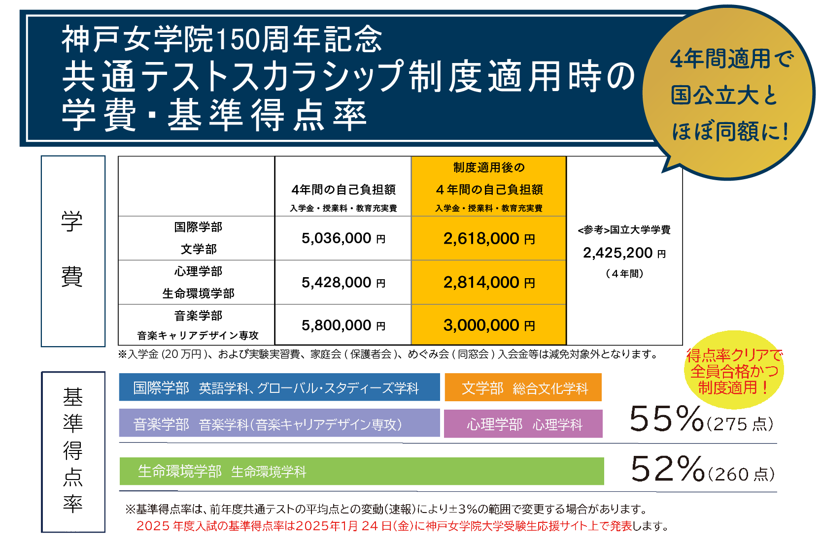 2025年に創立150周年を迎えるにあたり、「神戸女学院のリベラルアーツ教育」が目指す学生像に沿って、5科目以上の受験勉強に取り組んだ生徒を迎えることを目的として「共通テストスカラシップ制度」を制定した。