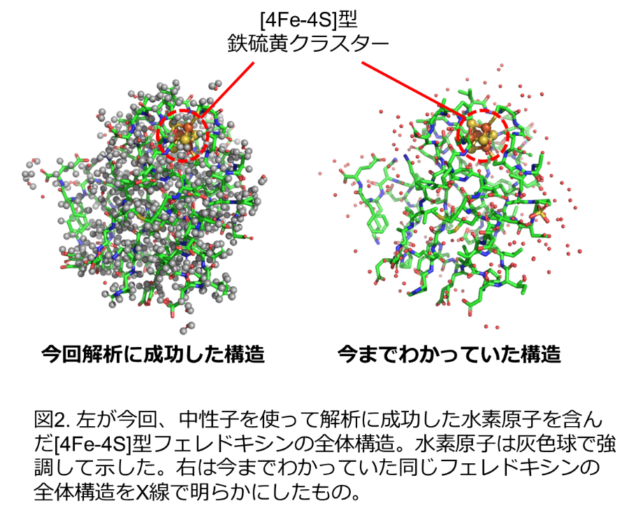 ・本研究では、中性子線を使った実験で、原子の中で一番小さな水素原子が見えるレベルで、フェレドキシンの精密な立体構造を明らかにすることに成功しました。中性子での精密な構造決定は非常に難易度が高く、タンパク質の立体構造のデータベース(Protein Data Bank; PDB)全体の0.2%以下しか報告例がありません。