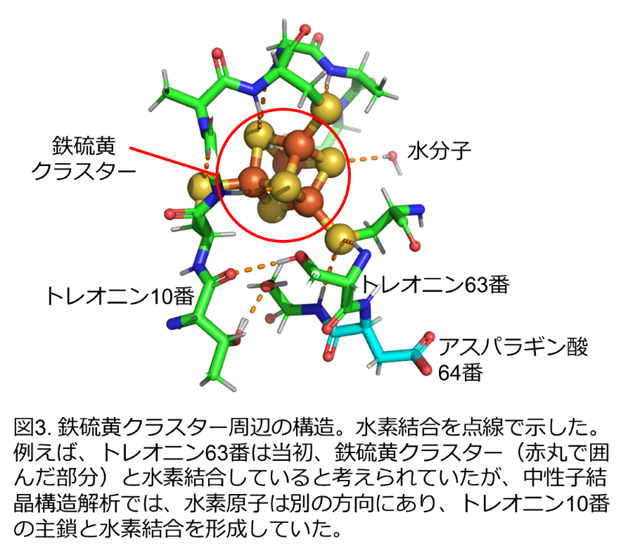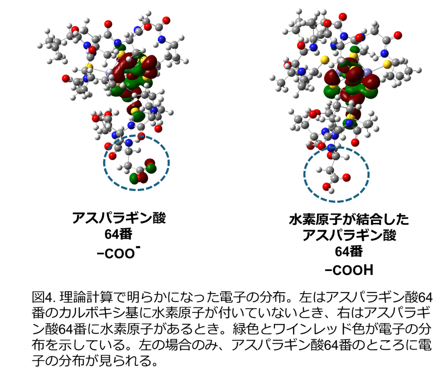 本研究では、分子の中に4つの鉄と4つの硫黄のクラスター([4Fe-4S]型クラスター; 図1)をもつフェレドキシンの立体構造を中性子結晶構造解析により決定し、鉄硫黄クラスター周辺の水素も含めた原子の正確な位置を実験的に明らかにしました(図2)。鉄硫黄クラスター周辺の水素原子の実際の位置は、これまで予測されていた位置とは異なることがわかりました(図3)。その正確な水素原子の位置を踏まえて、鉄硫黄クラスター周辺の電子状態を理論計算により求めたところ、鉄硫黄クラスターに由来する電子は、鉄硫黄クラスター周辺だけなく、1 nm(ナノメートル = 0.000001 mm)以上距離が離れた部位にあるアスパラギン酸64番まで拡がって分布していることを初めて発見しました(図3, 図4)。(1 nmはタンパク質分子の中の距離としては長くて直接相互作用はできません。)興味深いことに、この電子の拡がりは、アスパラギン酸64番の側鎖(カルボキシ基:-COOH)の水素原子がないとき(-COO-)のみに観られ、水素原子があるとき(-COOH)には、電子は鉄硫黄クラスター周辺のみに分布することがわかりました(図4)。実際に、鉄硫黄クラスターが酸化される速度と酸化還元電位を測定することで、アスパラギン酸64番が鉄硫黄クラスターの反応性に大きく影響していることを証明しました。フェレドキシンには複数のアスパラギン酸が含まれていますが、そのような現象が見られたのは、64番目のアスパラギン酸だけでした。さらに、種々の微生物に由来するフェレドキシンにおいても、同様の立体的位置にあるアスパラギン酸残基が鉄硫黄クラスターの電子状態に影響を与えることも明らかにしました。
