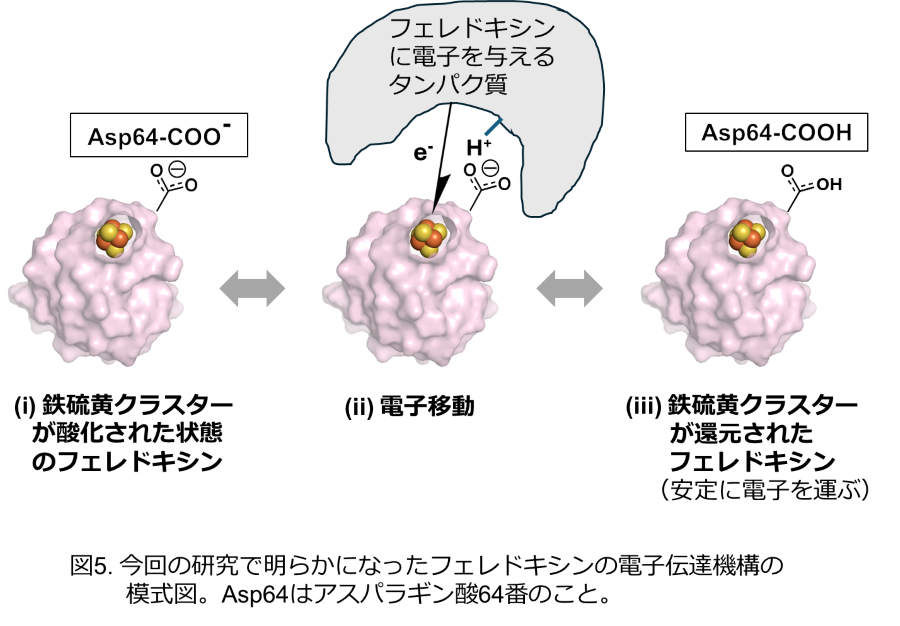 ・生体内で「電子の運び屋」として知られているフェレドキシンは、その内部に鉄と硫黄のかたまり(鉄硫黄クラスター)を保持した小さなタンパク質です。フェレドキシンはほとんどすべての生物に存在すると考えられているユニバーサルなタンパク質ですが、これまで、フェレドキシンが電子を安定に運ぶ仕組みは謎に包まれていました。