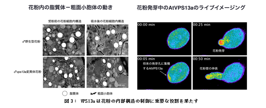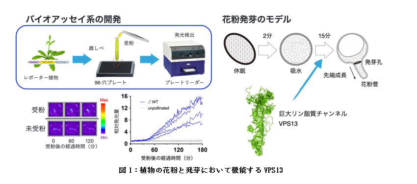 本研究ではホタルルシフェラーゼ(注1)を応用しラボ独自に開発した花粉活性検出システム(図1左)を用いることで、花粉の機能に必要なVPS13aタンパク質を同定しました。植物では初めてVPS13分子種の詳細な機能が明らかになり、この研究成果は今後植物の生殖制御に役立つことが期待されます。