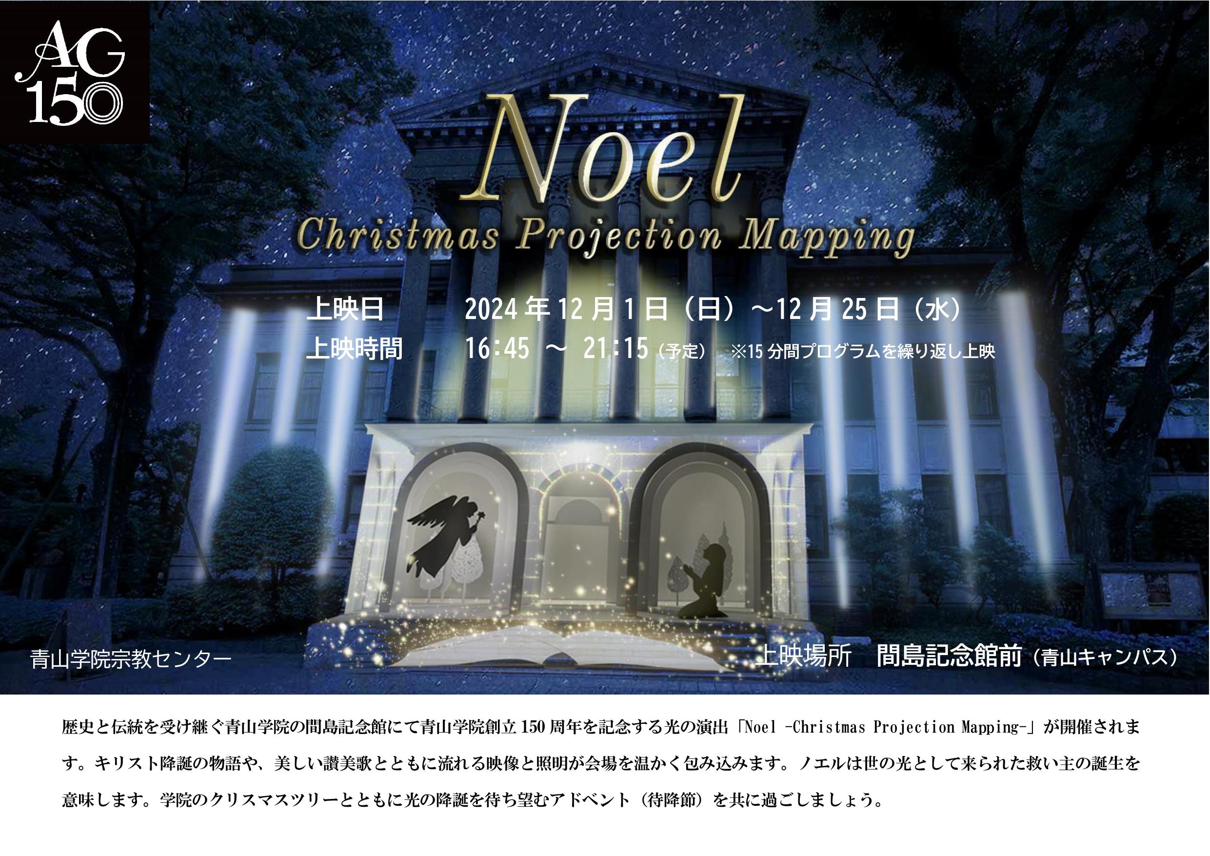 2024年12月1日(日)~25日(水)、青山学院創立150周年を記念して、プロジェクションマッピング「Noel -Christmas Projection Mapping-」を歴史と伝統を受け継ぐ青山学院の間島記念館にて開催する。キリスト降誕の物語や、美しい讃美歌とともに流れる映像と照明が会場を温かく包み込む。"Noel(ノエル)"は世の光として来られた救い主の誕生を意味する。学院のクリスマス・ツリーとともに、光の降誕を待ち望むアドベント(待降節)を共に過ごすイベントとなっている。また、2024年11月29日(金)、「青山学院クリスマス・ツリー点火祭~降誕を待ち望む礼拝~」を青山・相模原両キャンパスにて開催する。