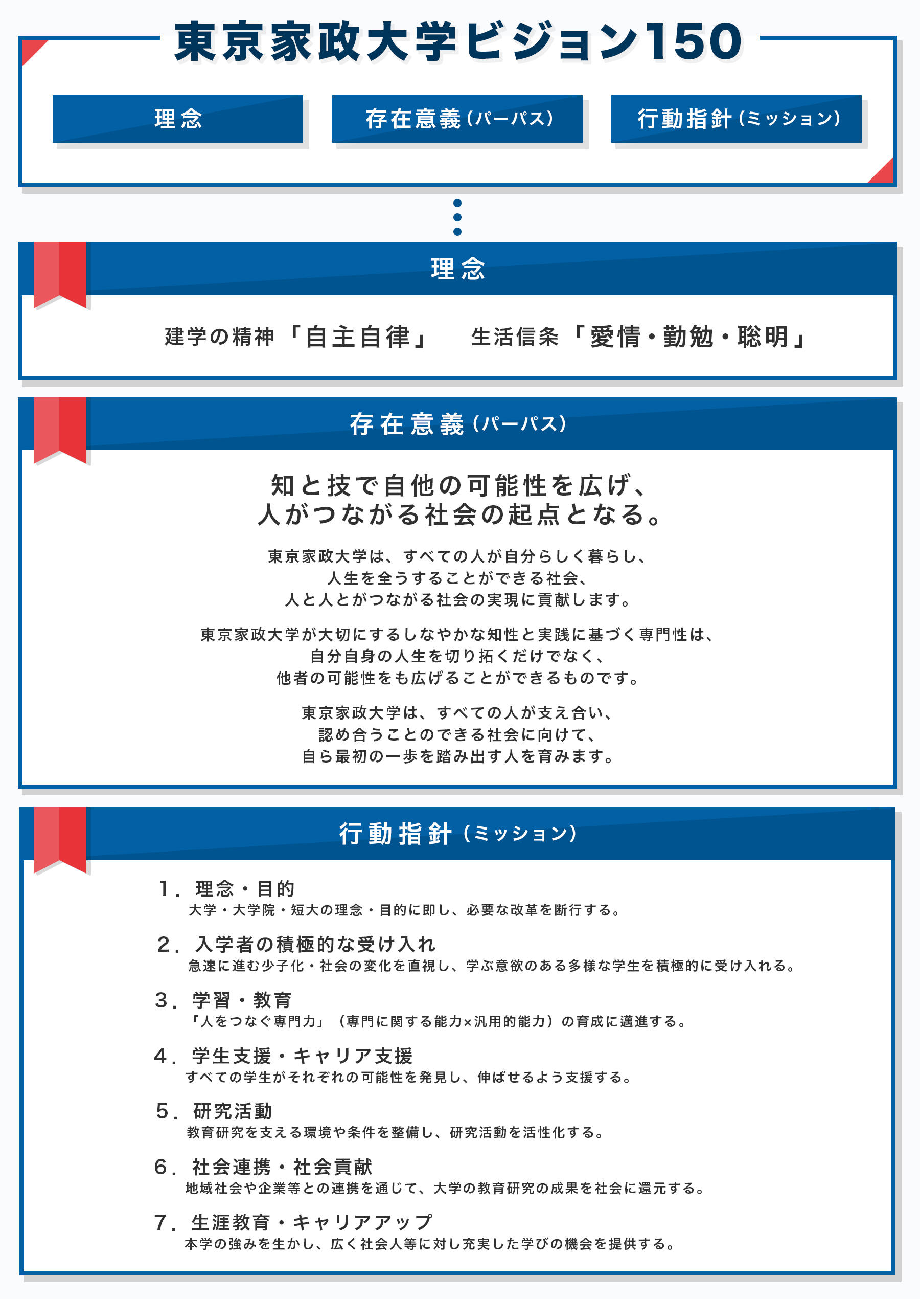 「東京家政大学ビジョン150」は、「理念」「存在意義(パーパス)」「行動指針(ミッション)」の3つの要素から構成される。