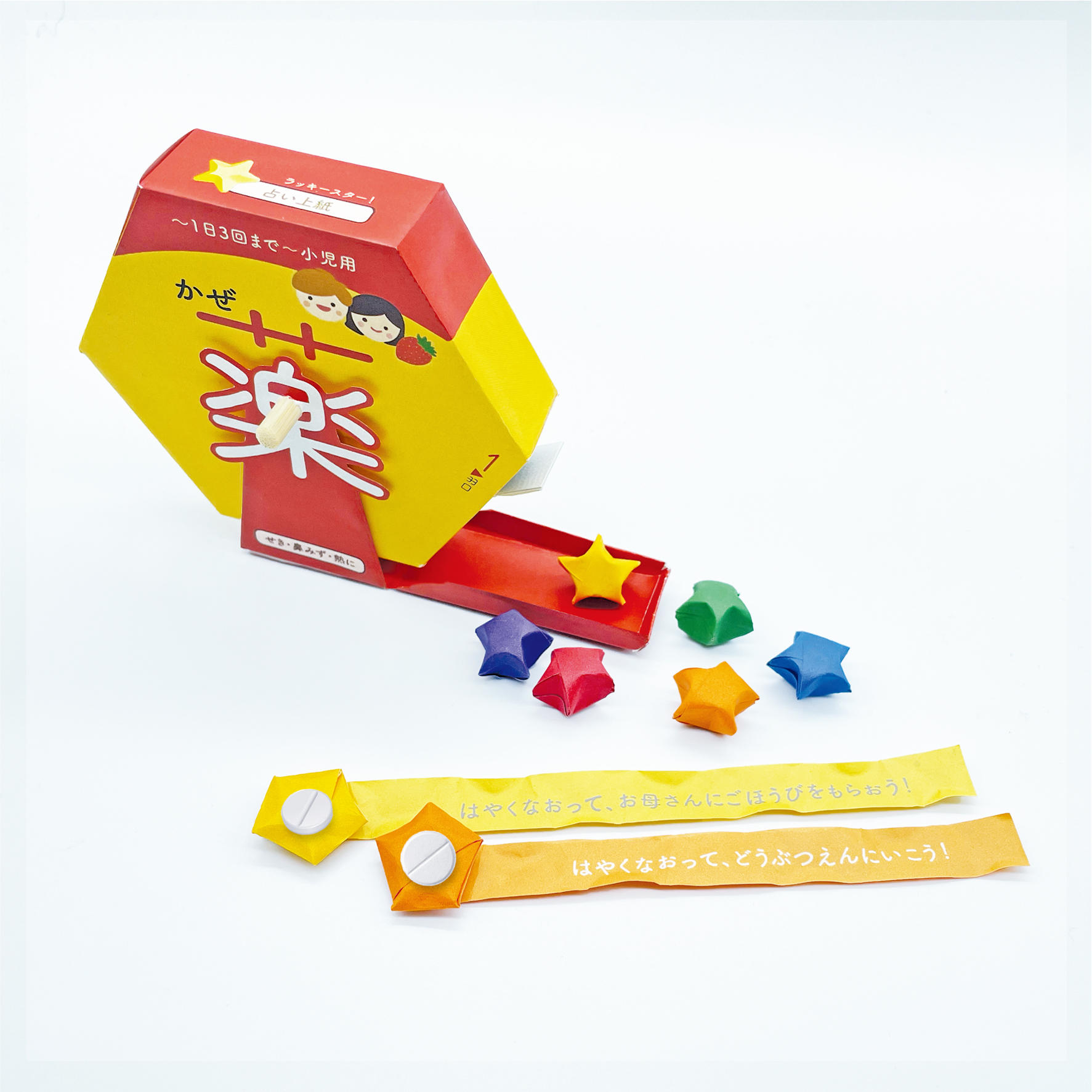 作品コンセプト:日本調剤の調査によると、乳幼児を持つ親の約6割が、子供が飲み薬を嫌がった経験があることが分かりました。 そこで、薬は怖いという先入観を変えるため、福引型のパッケージを考えました。パッケージをぐるぐる回すとラッキースターの形に包まれた錠剤が出てきます。錠剤に巻かれた紙を解いて広げると、運勢が書かれています。